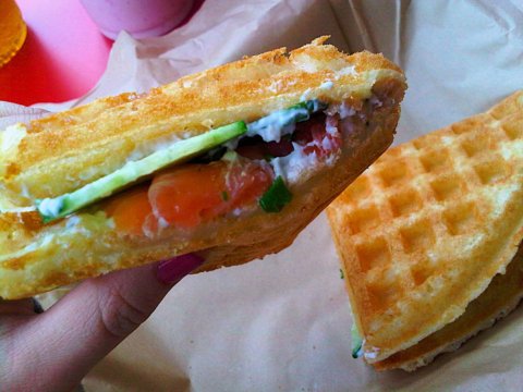 The concept of a waffle sandwich was so intriguing that even this super long line could not keep me from trying Bruxie. The line moved pretty slowly, but the chef/owner and workers walked the line answering questions and handing out menus for everyone to look over while they waited. Their menu features several staple savory and sweet options as well as daily specials. My bf and I tried a little bit of everything and the overall favorite was the fried chicken and waffle sandwich, which was surprisingly not overly heavy or oily. You know a place is popular and trendy when you see a film crew interviewing customers and filming an episode for their show. It's too bad I didn't catch the name of the show, I'm sure I could be seen in the background, stuffing my face. Next visit, I want to try the prosciutto & gruyere and lemon cream & berries waffles... Mmm.