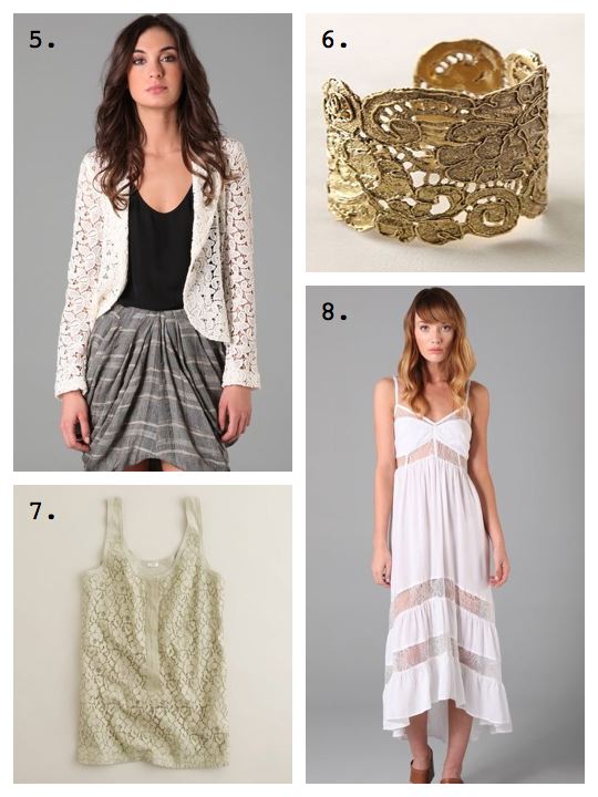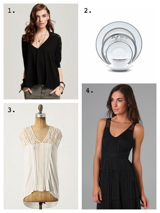 I admit, I woke up in the wee hours of the morning to witness the Royal Wedding, and truly loved every minute of it. I gasped as the new Duchess of Cambridge stepped out of the car in that gorgeous Sarah Burton for Alexander McQueen gown. Inspired by that breathtaking dress, I am officially loving all things adorned with lace. These are some of my current favorites...